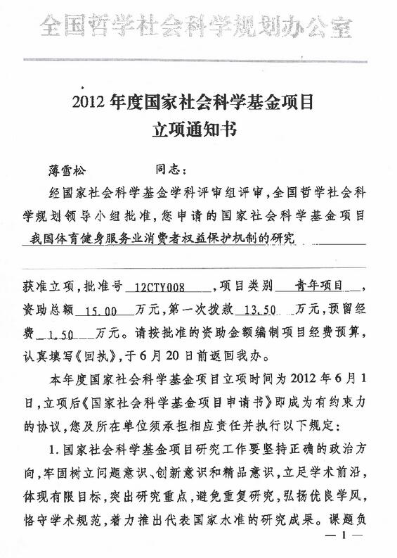 薄雪松获国家社会科学基金青年项目,项目编号为12CTY008,项目名称为<<我国体育健身服务业消费者权益保护机制的研究>>,项目于2012年6月开始。