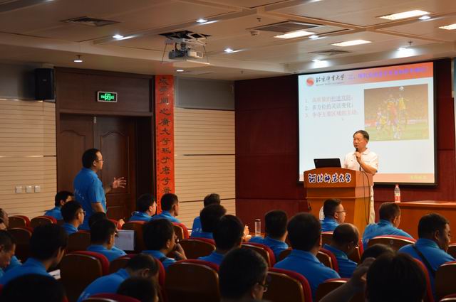 讲座中,张廷安教授首先通过结合足球技术发展趋势、足球战术发展趋势、足球运动员身体素质发展趋势、南非世界杯比赛后特点、巴西世界杯表现出的趋势、女子世界足球运动发展趋势、现代职业足球的发展趋势几个方面内容对“现代足球发展趋势”进行了阐述,详细的解读了在现代足球竞争中,足球运动员所需要具有的素质和能力。随后,张教授结合典型比赛案例视频以及相关权威数据更加直观的就职业优秀运动员的技能基本特点、世界杯表现出的特征、趋势和特点进行了介绍,使得难于理解的内容变得更加形象生动,易于理解和记忆。在有关于国内外人士对中国足球运动员的一些评价、中国运动员的差距等内容与学员进行互动,引发学员思考。讲座结束后,张教授和培训学员进行了交流,解答了学员提出的在实际教学和训练中遇到的一些困惑的问题。