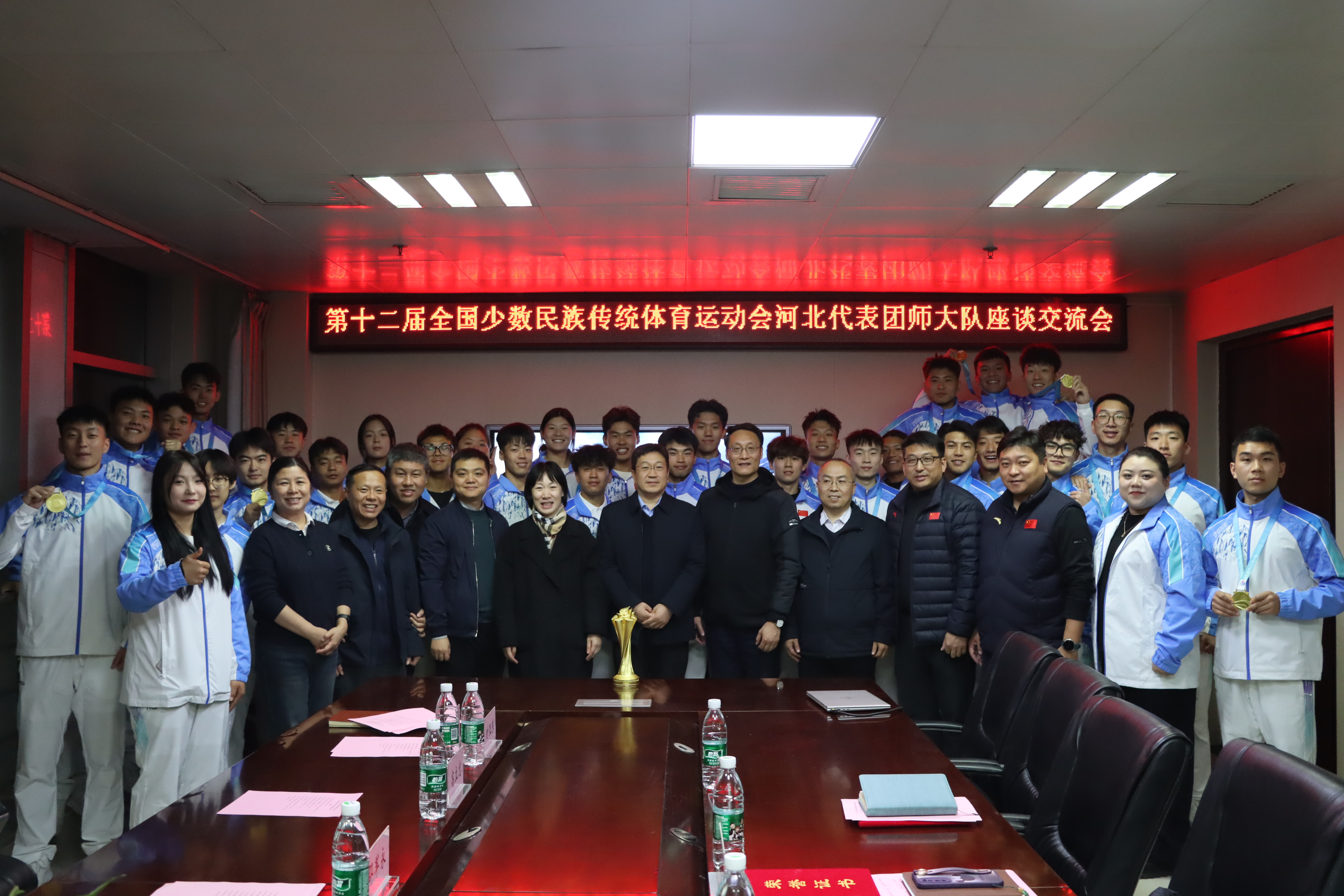 邵军永指出,全国少数民族传统体育运动会是民族团结的盛会,德赢学生参加全国性高规格赛事是一件幸事,大家既是参与者、贡献者,也是受益者。大家将河北地域优秀传统文化融入体育竞赛,呈现到全国赛台,既是对中华优秀传统文化的创新传承,也是对德赢ac米兰官方合作育人效果的展示。他强调,要深刻认识参与比赛的重要性、参赛主体的特殊性、竞赛内容的文化性特点;要认真总结为什么参赛、发现了什么、收获了什么,要将集体的荣誉、一致的目标、辛苦的付出转化为前进的动力。希望全体教练员、运动员把比赛带来的良好精神风貌带入到今后的工作和学习当中去,珍惜荣誉、团结协作、创新发展。德赢winac米兰体育文化传播系主任王淑英详细介绍组队参赛情况。她表示,德赢共派出38名运动员、4名教练员和3名领队,代表河北省参加板鞋竞速、高脚竞速和表演项目常山战鼓等三个项目的比赛。在备赛过程中,队伍面临少数民族运动员数量不足、技术理解不深刻、参赛经验少等多重挑战,在学院领导的支持和全体成员的共同努力下,大家克服重重困难,积极备战。最终,表演项目常山战鼓在170个参赛队中脱颖而出,荣获一等奖,成为河北省七个一等奖之一,高脚竞速和板鞋竞速项目也取得历史最好成绩。座谈会上,教练员和运动员们积极分享参赛感悟和收获。他们表示,通过参与这次大赛,不仅提升了运动技能和民族体育知识,还开拓了视野,增强了集体荣誉感,更加深刻地理解了铸牢中华民族共同体意识的重要性。与会领导对参赛队伍获得的优异成绩表示热烈祝贺。